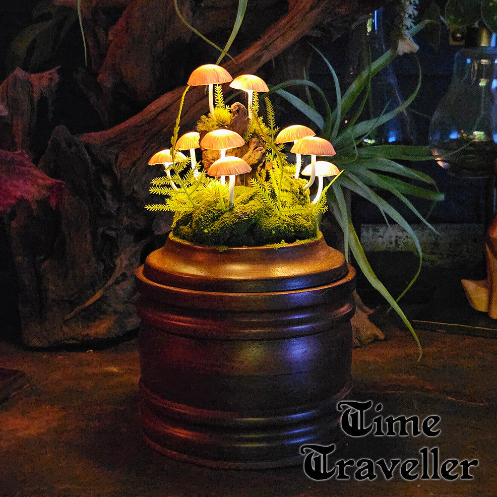 Lovely wooden jar with a decorative arrangement of mushrooms and moss. The mushrooms emit a soft, warm light, creating an enchanting, forest-like appearance. The lighting enhances the magical atmosphere, making the mushrooms appear bioluminescent